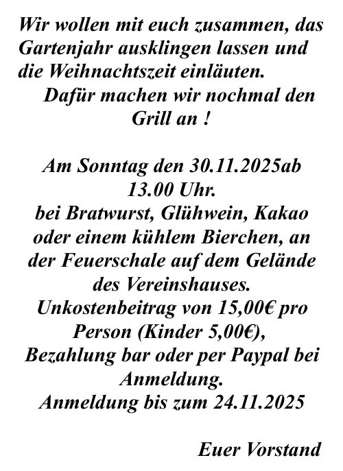 Gemeinschaftsarbeit kann auch außerhalb der genannten Zeiten (9.00 - 12.00 Uhr) verrichtet werden. Aber der Zeitraum von April bis Oktober ist einzuhalten. Bitte dafür beim Vorstand oder den Wegewarten melden. Es ist dringend notwendig hierfür immer genug Akteure zu bekommen. Die Arbeit können wir ansonsten nicht mehr leisten und müssen es extern vergeben. Was aber bedeutet, das für die einzelnen Gärten höhrere Kosten entstehen.